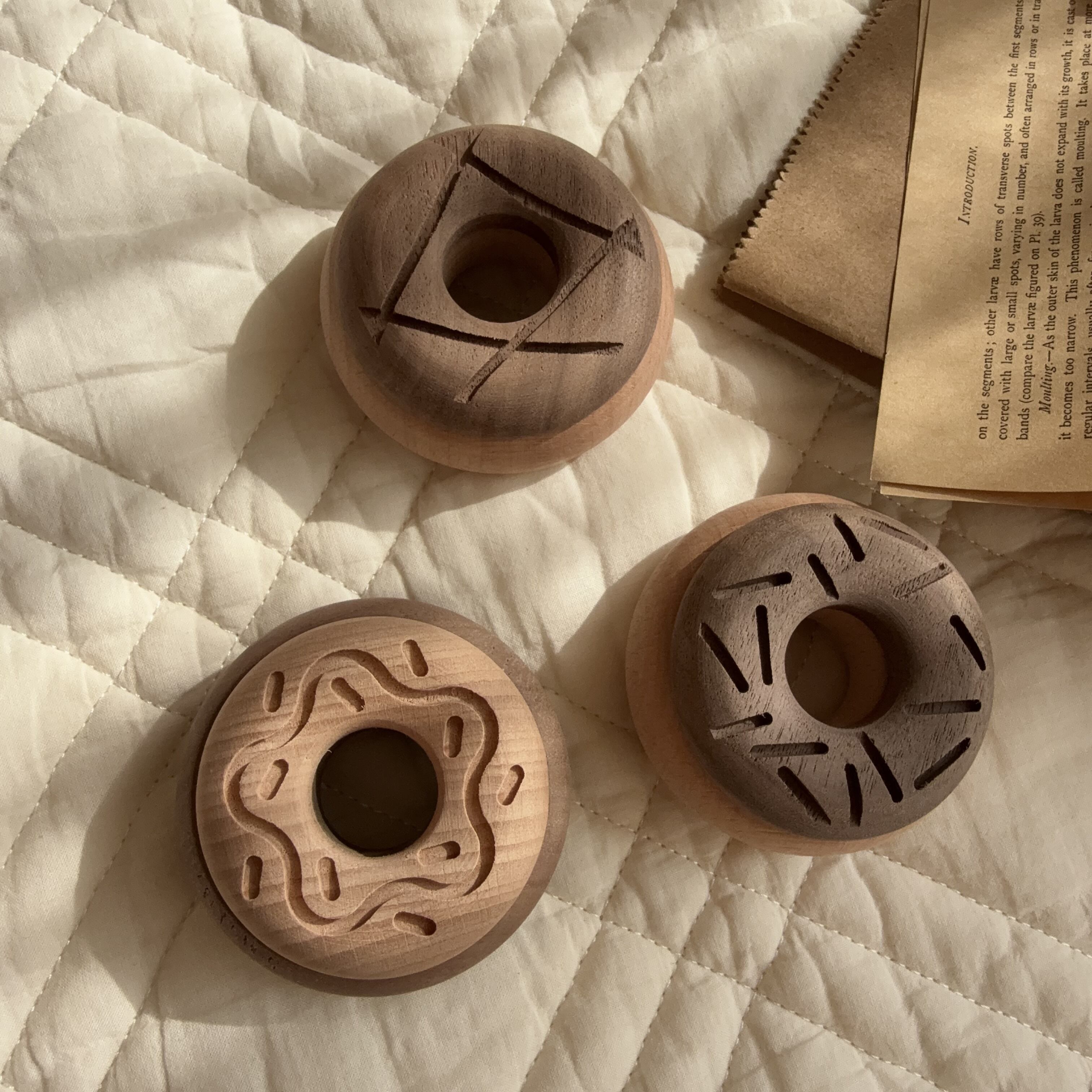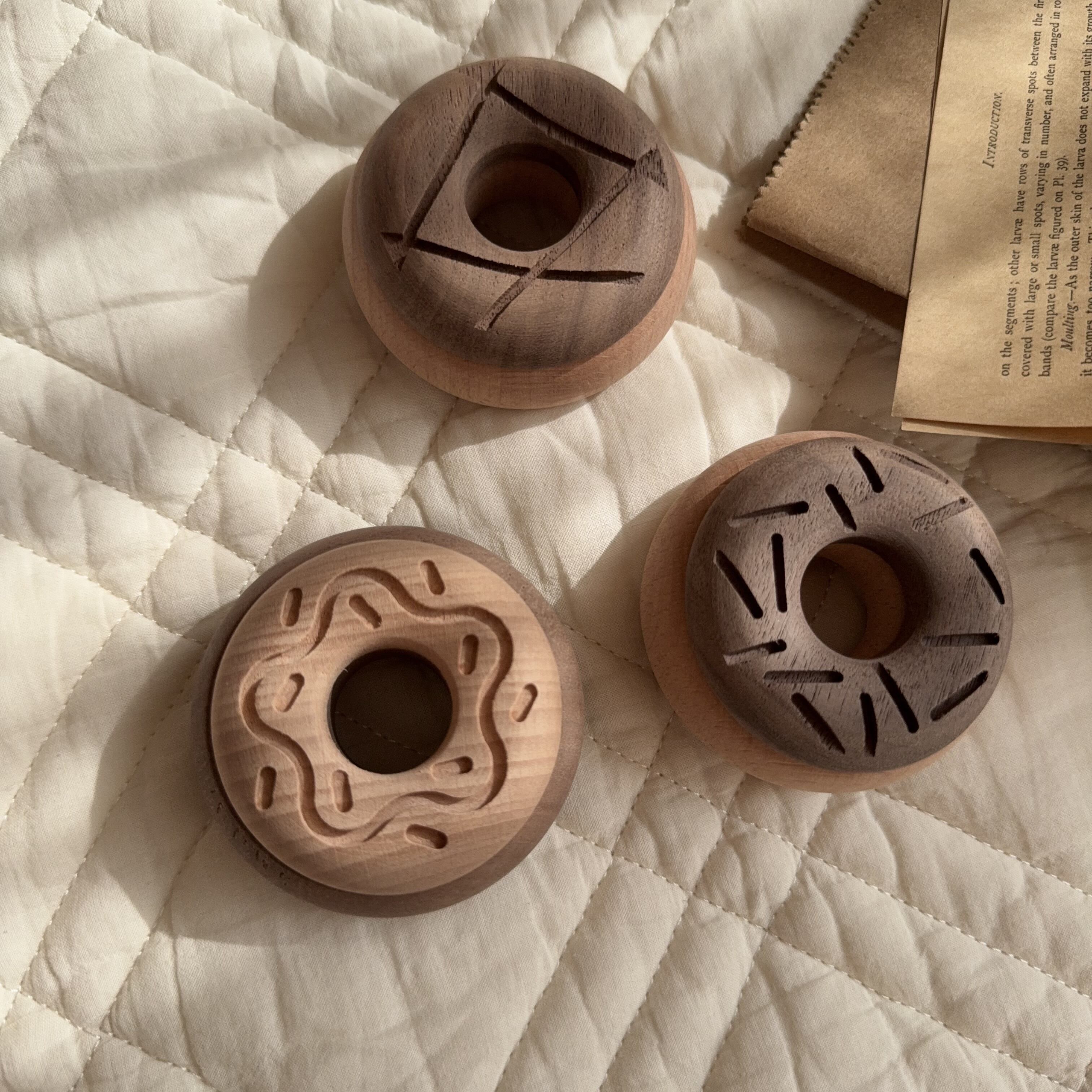 木製のドーナツ型おもちゃ、ナチュラルな仕上げで、遊び心を刺激する3個セットです。