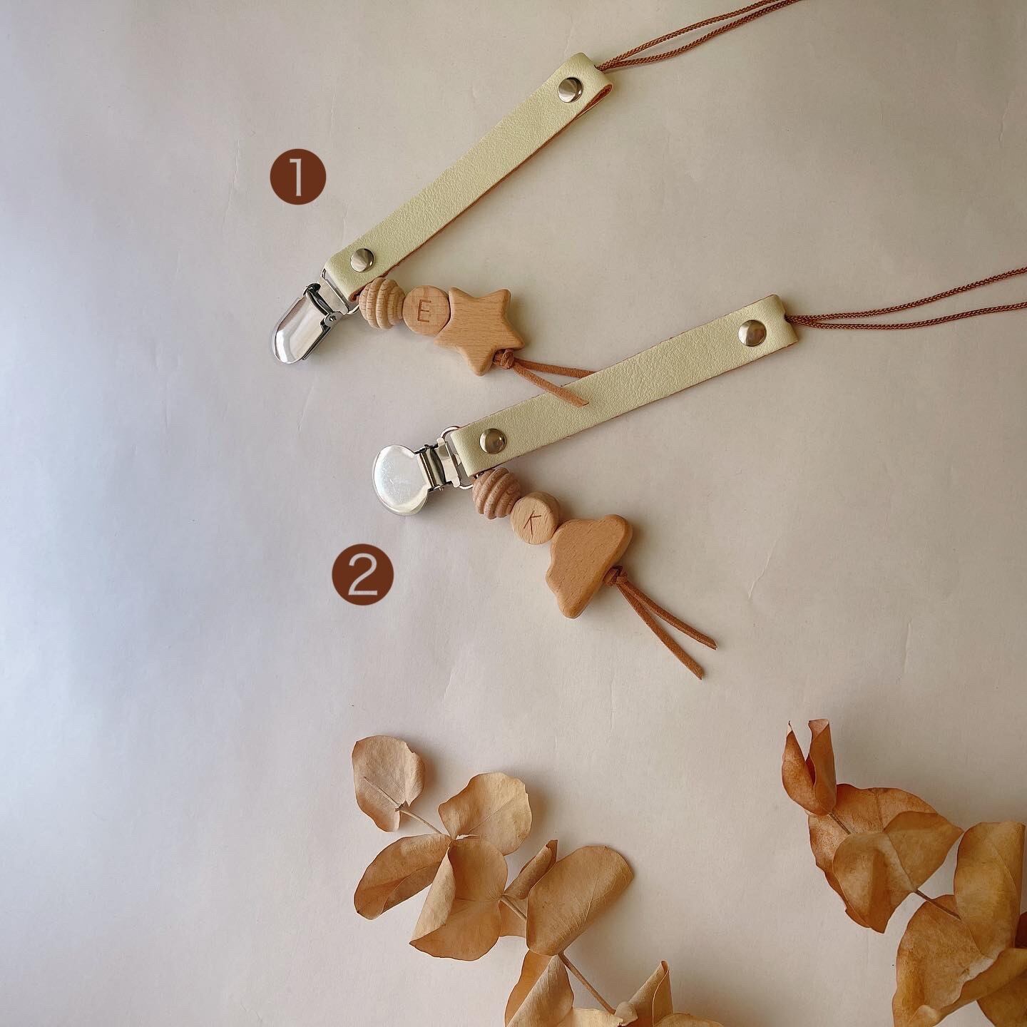 レザーと木のパーツで制作しましたイニシャルおしゃぶりホルダーです。