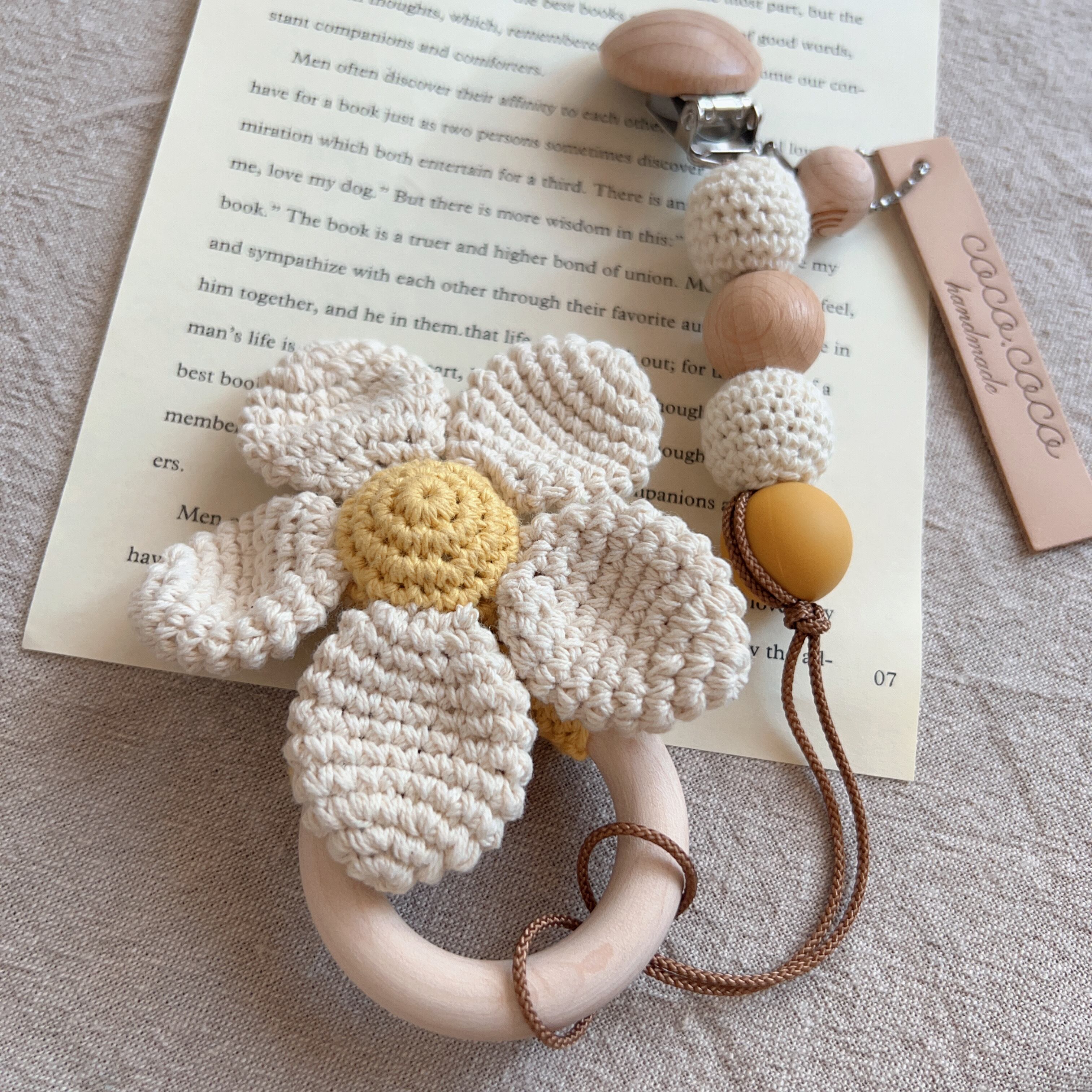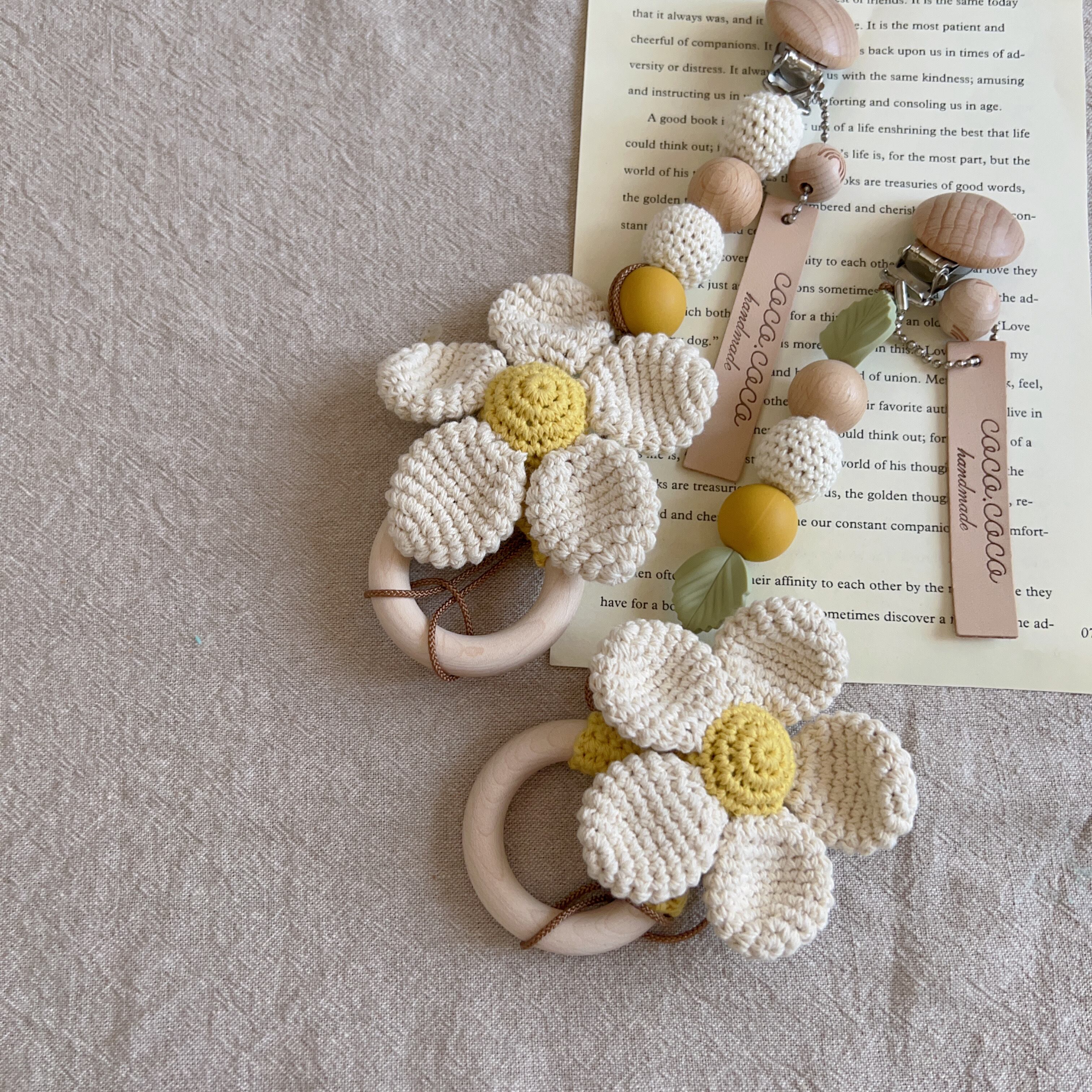 かわいい型で編み花のラトル&おしゃぶりホルダー